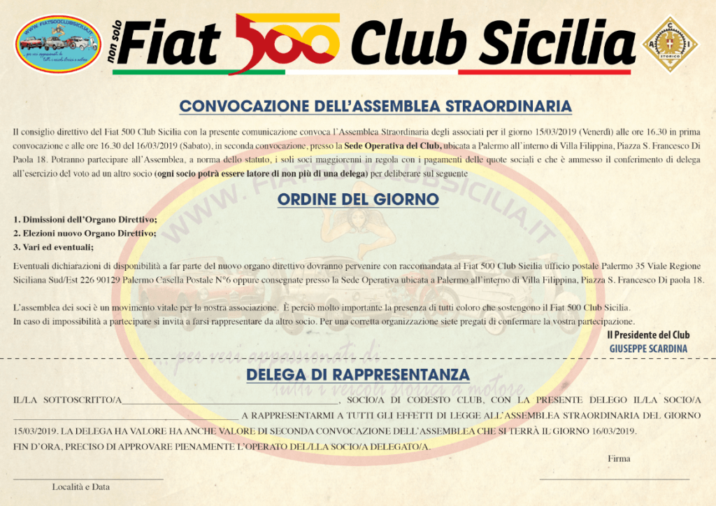 Il consiglio direttivo del Fiat 500 Club Sicilia, con la presente comunicazione convoca l’Assemblea Straordinaria degli associati per il giorno 15/03/2019 (Venerdì) alle ore 16.30 del 16/03/2019 (Sabato) in seconda convocazione, presso la Sede Operativa del Club, ubicata a Palermo all’interno di Villa Filippina, Piazza S.Francesco Di Paola 18.